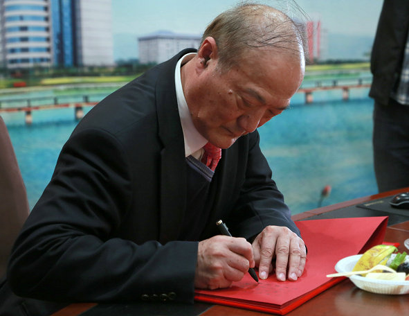 图为厉无畏先生为武汉长江工商学院学子写下寄语 摄影:崔婷