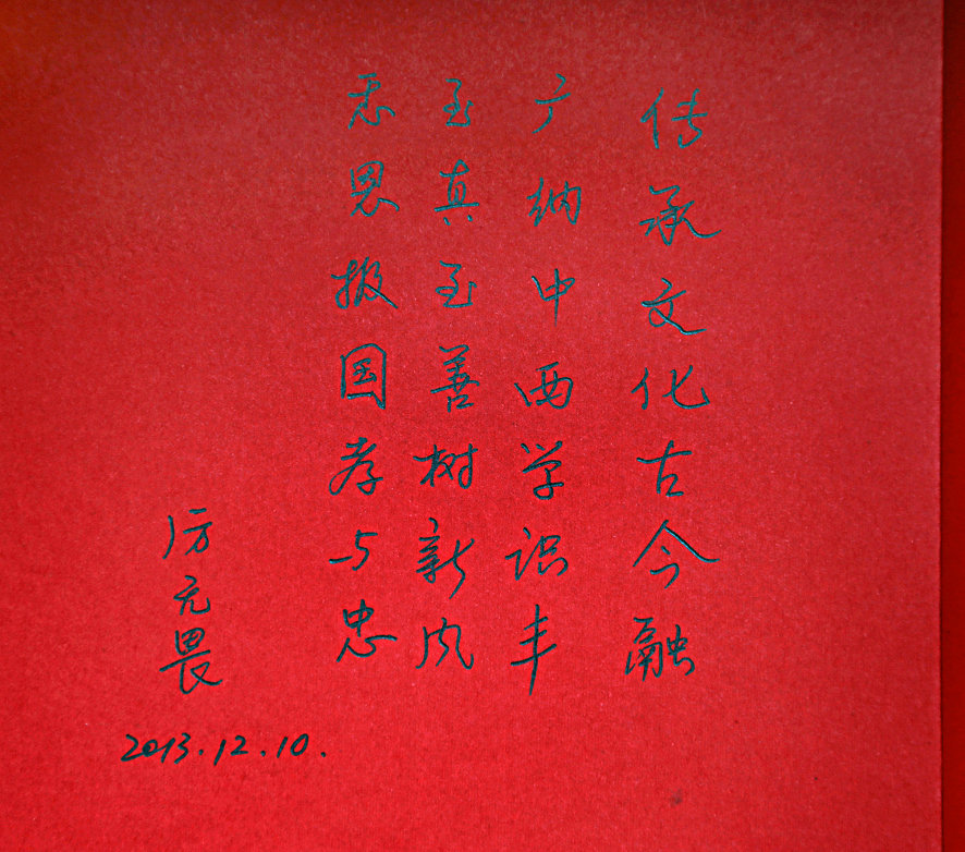 诗句内容如下:传承文化古今融,广纳中西学识丰,至真至善树新风,感恩报国孝与忠。