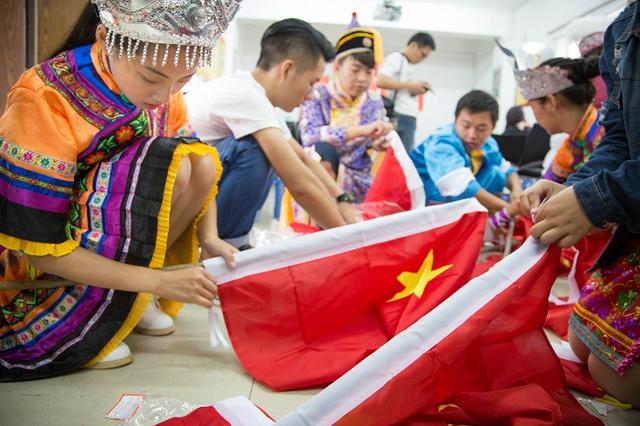 在活动现场,少数民族大学生们身着色彩绚丽的维吾尔族、蒙古族、哈萨克族、畲族等少数民族服装为居民们送国旗,并帮助居民们在各自阳台或楼层的楼道口进行悬挂。