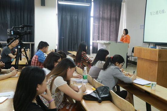 图为田主任正在为同学们介绍写作技巧