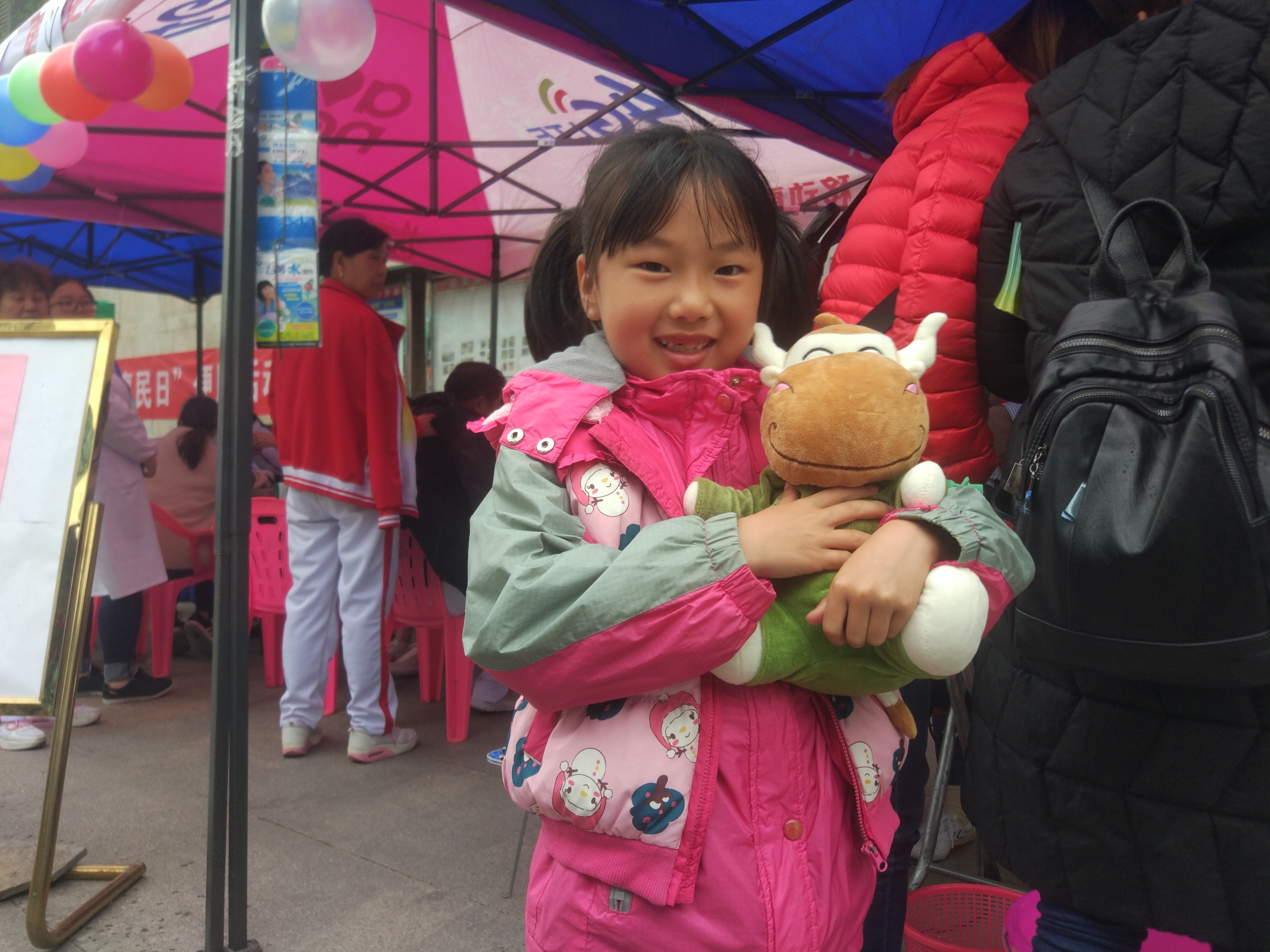 图为小朋友展示自己最新获得的小牛娃娃 摄影:曲光浩