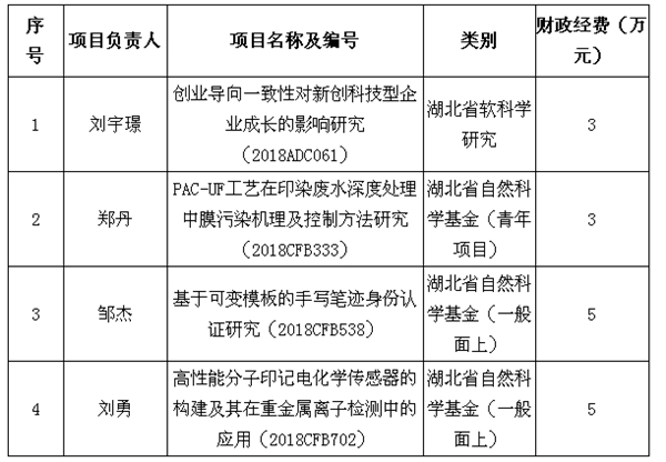 新闻中心讯(特约记者 曾荷爱)近日,湖北省科技厅下发了《关于下达2018年湖北省科技计划项目(第一批)的通知》(鄂科技发计﹝2018﹞3号),武汉工商学院获批2018年度湖北省科技计划项目4项,其中2项为湖北省自然科学基金一般面上项目,1项为湖北省自然科学基金青年项目,1项为湖北省技术创新专项(软科学研究)项目,总资助经费16万。总立项数和总立项经费均创历史新高,立项数位居全省同类高校前列。具体立项情况见下表: