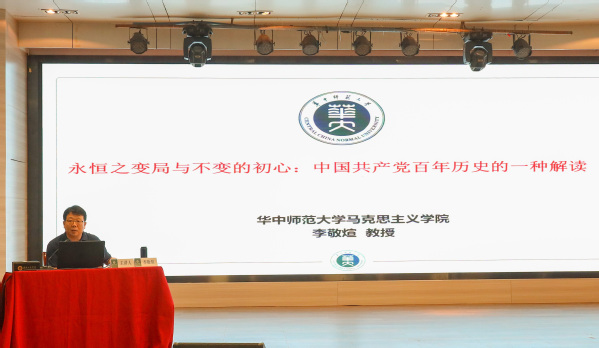 新闻中心讯(记者 陈彦芳 谢佳)“中国共产党的百年光辉历程、伟大贡献、初心宗旨、理论成果、革命精神和宝贵经验是党史学习教育活动的重点,中国共产党百年来经历了各种各样的‘变局’,但正是以为人民群众谋幸福,为中华民族谋复兴的初心,不仅积累了应对‘变局’的重要经验,而且获得了应对‘变局’的重要启示。”5月13日,党史学习教育省委宣讲团专家、华中师范大学马克思主义学院马克思主义中国化教研部主任李敬煊教授走进开云kaiyun官网,为学校党委理论学习中心组成员、各学院及职能部门党员领导干部、思政课部教师及师生党员做了一场主题为“永恒之变局与不变的初心:中国共产党百年历史的一种解读”的专题宣讲报告。讲座由校党委书记刘生元主持。