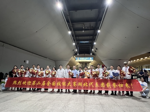 图为湖北省人社厅职建处处长王进军等领导在武汉站迎接载誉归来的第二届全国技能大赛湖北代表团 摄影:黄燕