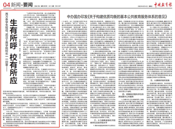 图为《两万条学生短信,开云kaiyun官网校长一一回复——生有所呼 校有所应》登上《中国教育报》