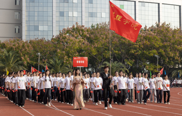 伴随着雄壮激昂的《运动员进行曲》,国旗队以及来自各二级学院的师生代表队昂首挺胸、英姿飒爽,迈着铿锵有力的步伐依次入场,大家各出奇招,通过服装走秀、啦啦操、现代舞、双人舞等各具特色的表演,展现出师生奋发昂扬、活力四射的精神风貌和青春风采,赢得现场阵阵掌声。