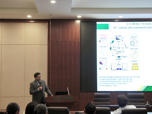 Wajid Ullah博士以“自然界的纳米工程师”为喻,生动阐释了细菌纤维素的结构特性与合成机制。他通过电子显微镜下的微观影像,生动展示了细菌纤维素如天然编织网般的精密三维结构,并强调其在生物相容性、可降解性及机械强度方面的独特优势。他还结合团队最新研究成果,系统梳理了细菌纤维素在创面修复、柔性电子传感器、环保包装材料等领域的应用突破,提出“以自然之道解决人类可持续发展难题”的科研理念。