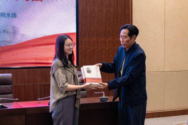 图为熊永铸先生向学校马克思主义学院赠送书籍《共和先声——辛亥武昌首义发难元勋熊秉坤纪念文集》 摄影:余剑韬