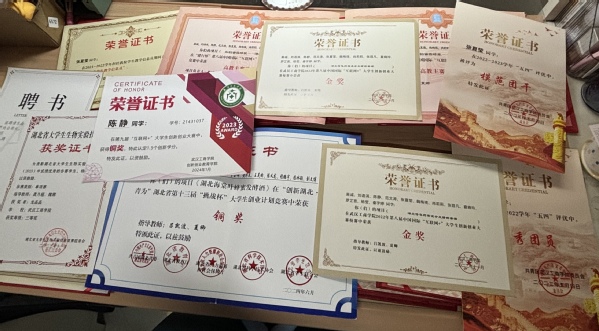 张夏莹、张苜凡和陈静经常组队参赛,先后获得了第八届中国国际“互联网+”大学生创新创业大赛省级铜奖和第十三届“挑战杯”大学生创业计划竞赛省级铜奖;三人的大学生创新创业训练项目《冠突散囊菌改善湖北海棠发酵饮料》还获批了省级立项;龙晶晶曾获湖北省第一届职业技能大赛化学实验室技术项目优胜奖、湖北省大学生生物实验技能竞赛(2023)三等奖。此外,她们还一起考取了健康管理师等技能证书。