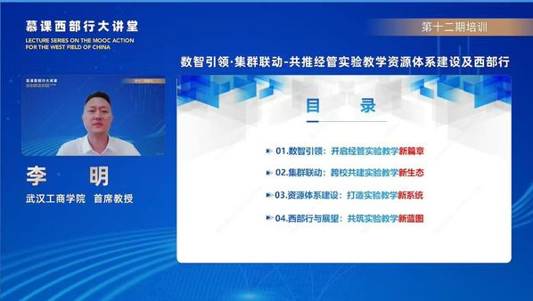 新闻中心讯(特约记者 高丽丽)7月3日下午,开云kaiyun官网首席教授李明受邀在教育部“慕课西部行大讲堂”中作题为《数智引领·集群联动——共推经管实验教学资源体系建设及西部行》的线上主题报告,此次报告展示了李明教授及其团队(核心成员:张丹丹、黄颖、吴迪)在经管类实验教学领域的创新探索与实践成果,为全国经管类实验教学资源的共建共享及“实验教学西部行”提供了宝贵经验。