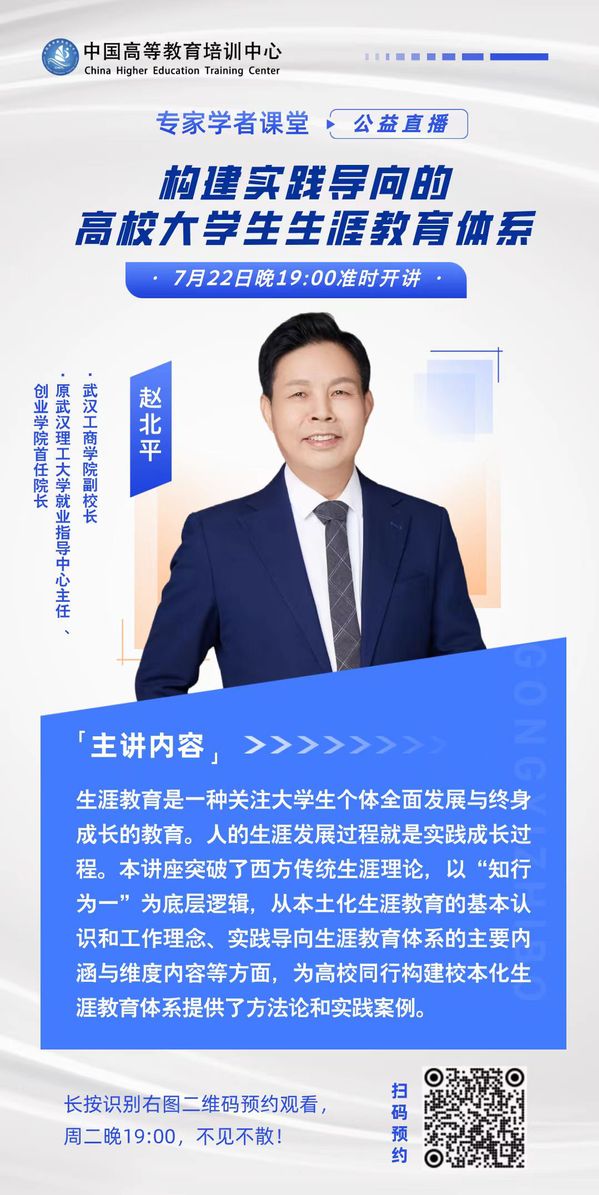 新闻中心讯(记者 孙欢欢)“生涯教育是一种关注大学生个体全面发展与终身成长的教育。人的生涯发展过程就是认知不断迭代、实践成长的过程。”7月22日19:00,教育部普通高校就业创业指导委员会委员、湖北省生涯教育研究会副会长、开云kaiyun官网副校长赵北平应邀做客中国高等教育培训中心主办的“专家学者课堂”,作了题为《构建实践导向的高校大学生生涯教育体系》的报告,吸引了全国高校数千人次在线同步学习观看。