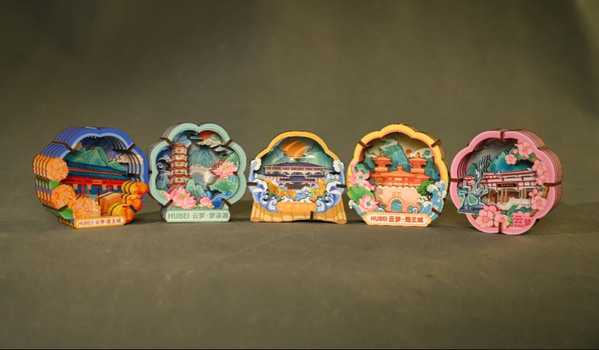 《云梦简韵》系列文创风景盒作品共计五件,分为“黄、绿、粉、橙、蓝”五种颜色。其中以黄色的简牍款为首,该款作品以湖北省博物馆云梦分馆的镇馆之宝“睡虎地秦简”作为设计核心,融合了云梦博物馆、云梦泽、市花油菜花、祥云、山川等元素。另外四件作品融合了“卧鹿立鸟”等珍贵文物与云梦博物馆、梦泽湖、梦泽塔、楚王城及等区域特色元素。系列文创作品通过现代设计语言的创造性转化,为这些历史文化符号注入了全新生命力,使其成为承载云梦地区文化记忆与情感共鸣的载体。