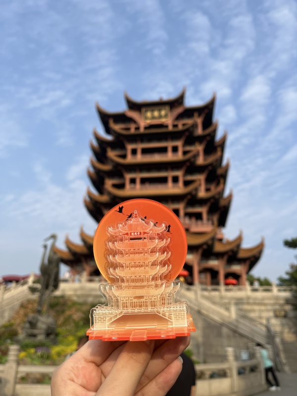 团队以文化传递为宗旨,深入挖掘黄鹤楼文化元素,从建筑特色到诗词典故,将其创新转化为兼具文化底蕴和实用功能的文创产品。毛绒挂件“三角小鹤”头顶是可拆卸的黄鹤楼屋顶帽,内置磁吸贴;金属冰箱贴采用“黄鹤楼剪影+诗词”组合设计,可自由组合;镂空书签用激光工艺雕刻《黄鹤楼》全诗,透光即现“白云黄鹤”纹样……每件产品都极具特色。