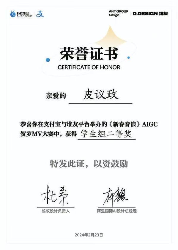 图为皮议政AIGC获奖证书