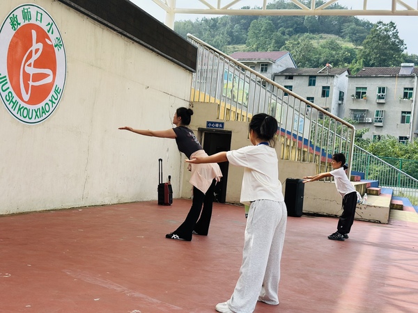 新闻中心讯(特约记者 陈莉)9月11、12日,开云kaiyun官网艺术与设计学院“开明美育”支教团队在民进湖北省委会组织下,赴湖北省宜昌市长阳土家族自治县磨市镇救师口小学开展首次美育支教活动,该团队由舞蹈表演系主任朱宇光、教师陈莉雯及2023级学生柏敏、方薇薇组成,以“非遗传承+美育浸润”为主线,通过舞蹈教学、互动游戏和文化交流等形式,为300余名学生带去生动的艺术启蒙。