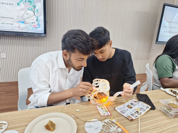 月饼品尝环节更是香气弥漫、笑语不断。莲蓉的绵密、五仁的丰富、豆沙的香甜……八种风味轮番登场,留学生们一边品尝,一边开心地交流着各自国家的节日习俗。“这个味道太棒了!”一位利比里亚学生举着月饼,满脸惊喜。不同文化在舌尖相遇,团圆的意义也在分享中传递。