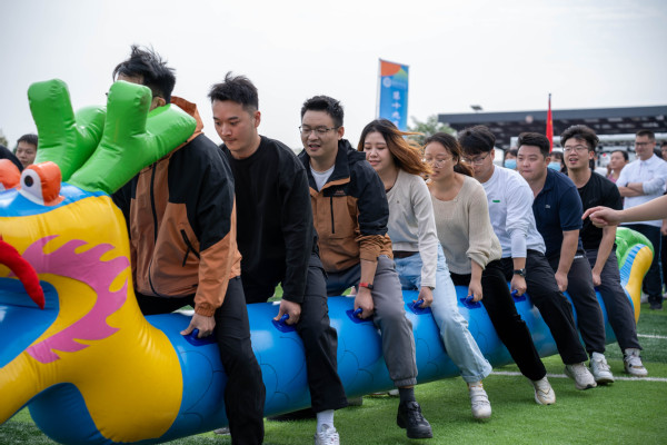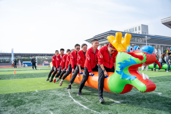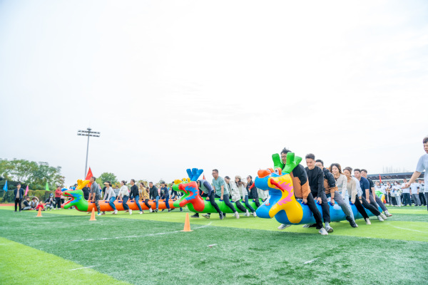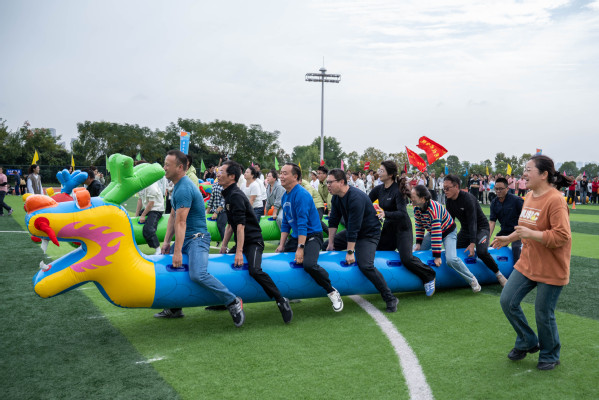 压轴登场的“旱地龙舟”项目同样吸引了众多师生围观助威。只见各组教师跨坐在色彩鲜艳的充气龙舟上,双手紧握龙身固定物,随着发令声响,他们步调一致地高喊“一二、一二!”以脚代桨,奋力“划”舟前行。这项比赛看似简单,却极其考验团队的节奏感与协调性,有的队伍配合默契,“龙舟”如离弦之箭;有的则因步伐错乱而“搁浅”赛道或“人仰舟翻”,憨态可掬的姿态引得师生们开怀大笑,加油声、欢笑声汇成一片,现场成了欢乐的海洋。