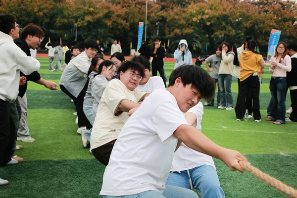 在学生混合组拔河比赛中,经济与商务外语学院代表队凭借出色表现勇夺桂冠,赛后,团队负责人、来自金融学专业的学生林子拓表示:“能够夺冠,我们感到非常激动,这是大家共同努力的结果。平时训练中的每一滴汗水,每一次配合,我们都看在眼里,也坚信付出终有回报。拔河是一项极其注重团队协作的运动,所以我相信只要我们重心保持在一起,劲往一处使,全员凝聚成一股绳,就没有克服不了的困难。”