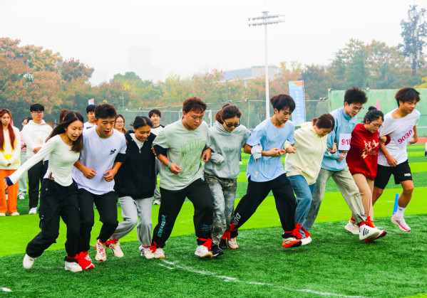 图为教职工组“旱地龙舟”项目比赛现场 摄影:贺熊邹 曹子涵