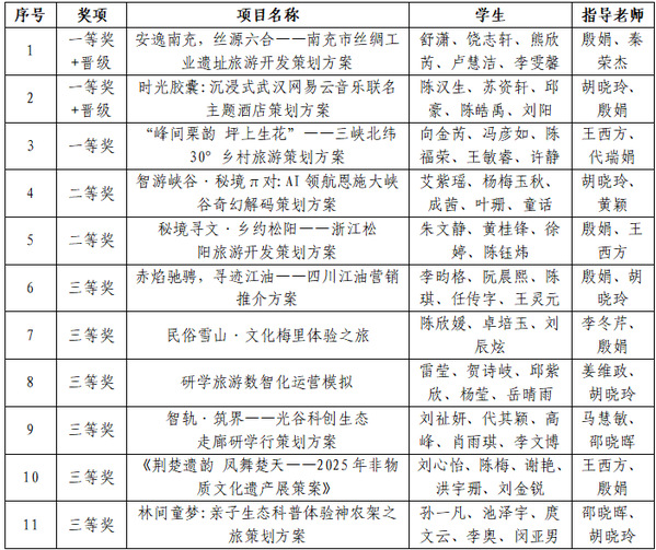 学校团队师生从3月开始备赛,9月参加省赛,11月进行国赛,竞赛历时9个月。在全国总决赛中,面对来自全国各地的强劲对手,武工商学子沉着冷静,发挥出色,最终有3支代表队斩获一等奖,其中“安逸南充,丝源六合——南充市丝绸工业遗址旅游开发策划方案” “时光胶囊:沉浸式武汉网易云音乐联名主题酒店策划方案”2支项目团队还成功晋级精英赛,将于本月21至24日前往浙江永康与来自全国各地的优秀团队再次同台竞技。