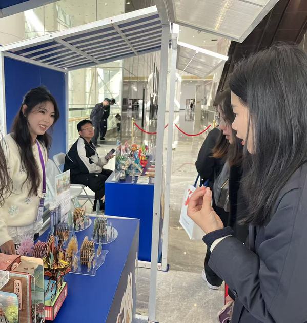 作品从创意到成品,离不开校企协同的支撑。学院与武汉金运互动传媒有限公司合作共建文创中试平台,为学生提供从设计、打样到生产的全流程实践机会。2022级视觉传达设计专业学生孙薛宝、孔令敏在分享创作“江汉揽胜图书立”过程时表示,团队利用AI技术对古画进行智能转化,结合3D建模反复调试,历时近六个月最终完成作品,“这是一次从理论到实践的跨越”。2023级学生石婷谈到,“从课堂作业走向社会展示,让我真正理解了设计为文化赋能的意义。”
