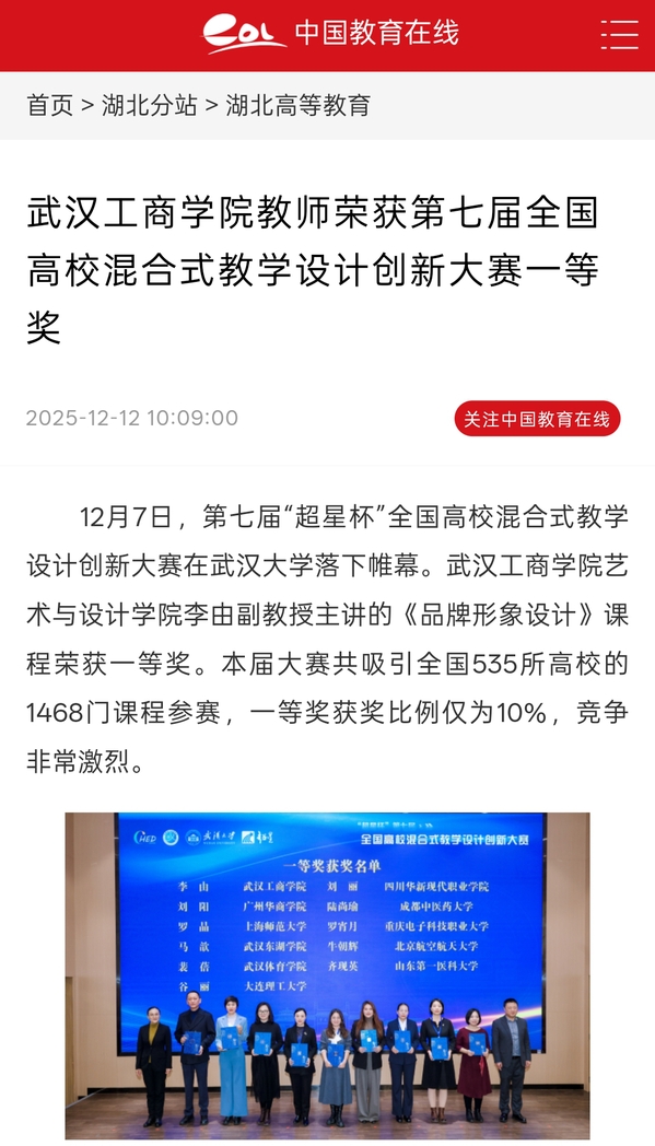 12月7日,第七届“超星杯”全国高校混合式教学设计创新大赛在武汉大学落下帷幕。开云kaiyun官网艺术与设计学院李由副教授主讲的《品牌形象设计》课程荣获一等奖。本届大赛共吸引全国535所高校的1468门课程参赛,一等奖获奖比例仅为10%,竞争非常激烈。