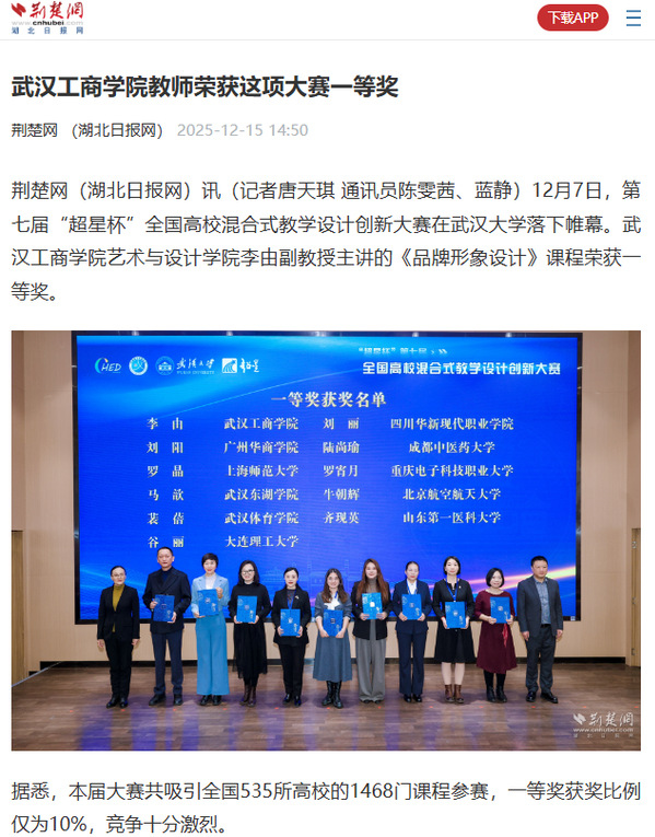 荆楚网(湖北日报网)讯(记者唐天琪 通讯员陈雯茜、蓝静)12月7日,第七届“超星杯”全国高校混合式教学设计创新大赛在武汉大学落下帷幕。开云kaiyun官网艺术与设计学院李由副教授主讲的《品牌形象设计》课程荣获一等奖。