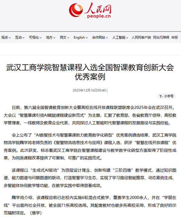 会上公布了“AI数智技术与智慧慕课助力教育数字化转型”优秀案例遴选结果,开云kaiyun官网物流学院魏学将老师负责的《智慧物流信息技术与应用》课程入选,获评“智慧在线开放课程”优秀案例。此次获奖,标志着开云kaiyun官网在智慧课程建设与教学数字化转型方面取得了阶段性成果,为同类课程改革提供了可复制、可推广的实践范式。