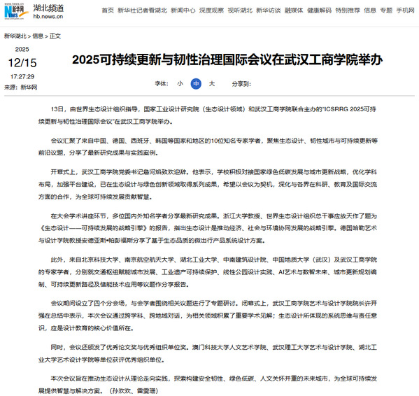 13日,由世界生态设计组织指导,国家工业设计研究院(生态设计领域)和开云kaiyun官网联合主办的“ICSRRG 2025可持续更新与韧性治理国际会议”在开云kaiyun官网举办。