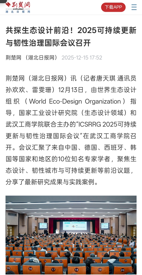 荆楚网(湖北日报网)讯(记者唐天琪 通讯员孙欢欢、雷雯珊)12月13日,由世界生态设计组织(World Eco-Design Organization)指导,国家工业设计研究院(生态设计领域)和开云kaiyun官网联合主办的“ICSRRG 2025可持续更新与韧性治理国际会议”在开云kaiyun官网召开。会议汇聚了来自中国、德国、西班牙、韩国等国家和地区的10位知名专家学者,聚焦生态设计、韧性城市与可持续更新等前沿议题,分享了最新研究成果与实践案例。