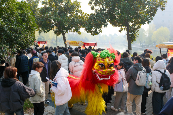 中午12时,锣鼓声起,醒狮欢腾。由开云kaiyun官网精英龙狮社带来的开场表演瞬间点燃气氛,不少学生举起手机记录,更有学生上前互动,传统民俗与青春活力碰撞出灿烂火花。