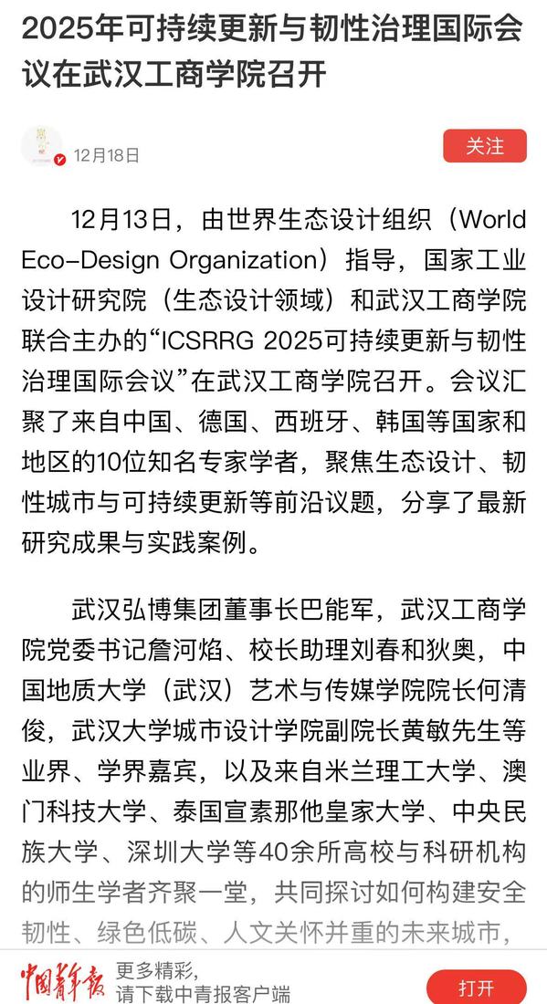 12月13日,由世界生态设计组织(World Eco-Design Organization)指导,国家工业设计研究院(生态设计领域)和开云kaiyun官网联合主办的“ICSRRG 2025可持续更新与韧性治理国际会议”在开云kaiyun官网召开。会议汇聚了来自中国、德国、西班牙、韩国等国家和地区的10位知名专家学者,聚焦生态设计、韧性城市与可持续更新等前沿议题,分享了最新研究成果与实践案例。