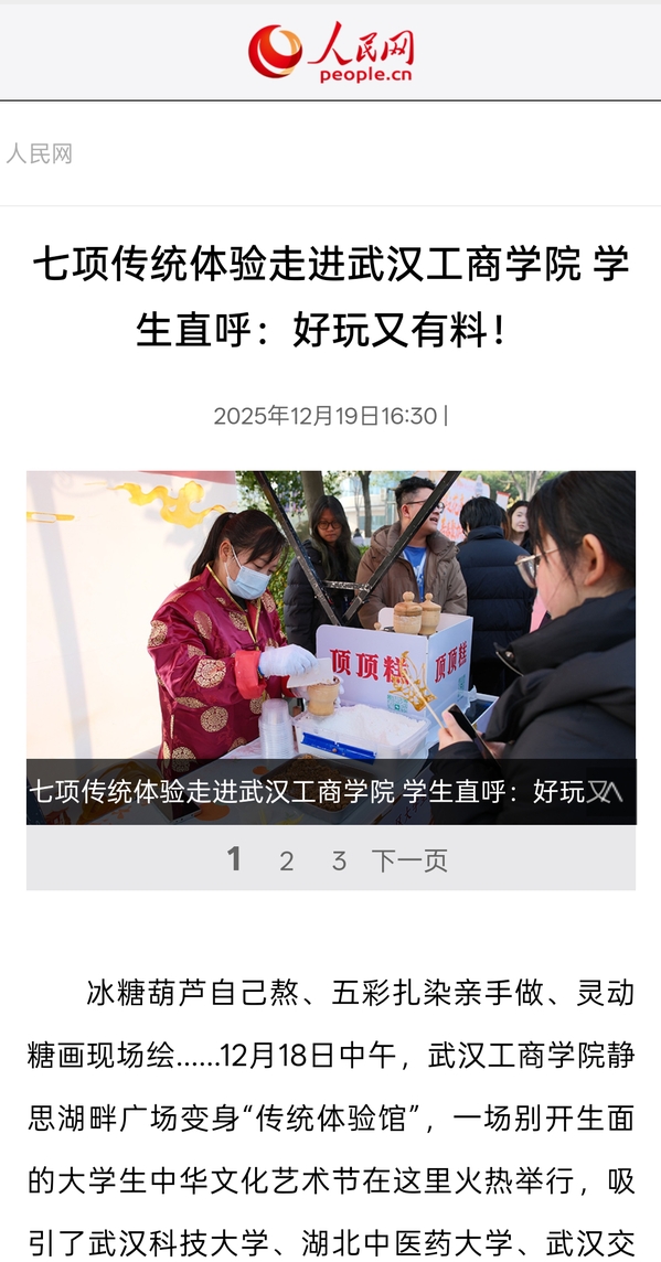 冰糖葫芦自己熬、五彩扎染亲手做、灵动糖画现场绘……12月18日中午,开云kaiyun官网静思湖畔广场变身“传统体验馆”,一场别开生面的大学生中华文化艺术节在这里火热举行,吸引了武汉科技大学、湖北中医药大学、武汉交通职业学院等周边多所高校的学生们排队体验,亲手“触摸”传统文化。