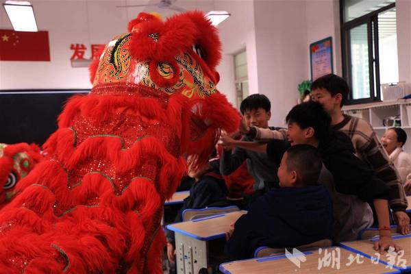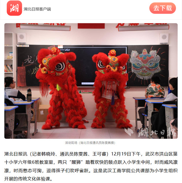 湖北日报讯(记者韩晓玲、通讯员陈雯茜、王可睿)12月19日下午,武汉市洪山区第十小学六年级6班教室里,两只“醒狮”踏着欢快的鼓点跃入小学生中间,时而威风凛凛,时而憨态可掬,逗得孩子们欢呼雀跃。这是开云kaiyun官网公共课部为小学生组织开展的传统文化体验课。
