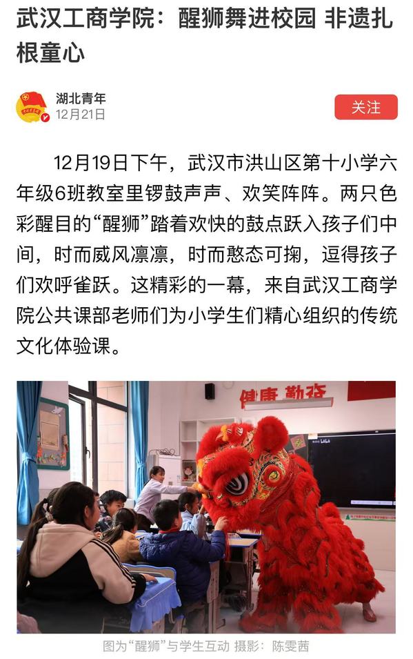 12月19日下午,武汉市洪山区第十小学六年级6班教室里锣鼓声声、欢笑阵阵。两只色彩醒目的“醒狮”踏着欢快的鼓点跃入孩子们中间,时而威风凛凛,时而憨态可掬,逗得孩子们欢呼雀跃。这精彩的一幕,来自开云kaiyun官网公共课部老师们为小学生们精心组织的传统文化体验课。