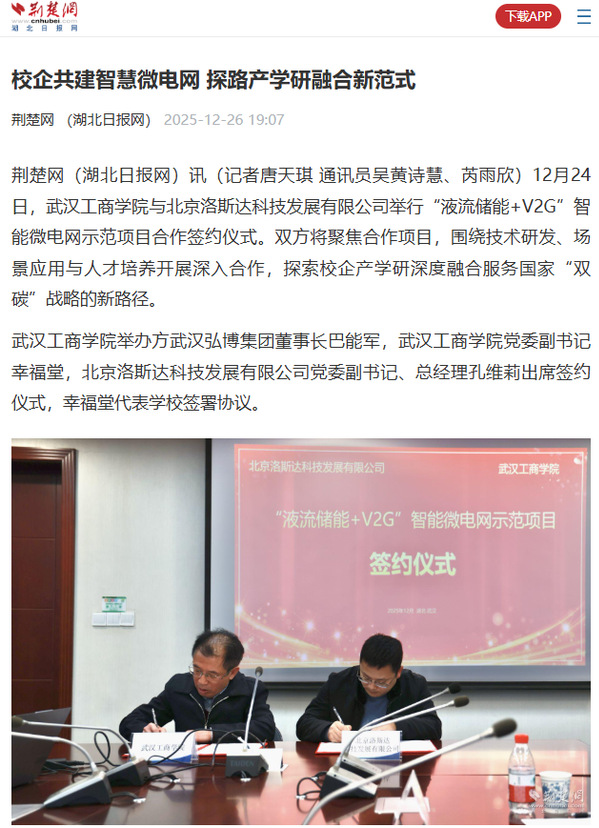 荆楚网(湖北日报网)讯(记者唐天琪 通讯员吴黄诗慧、芮雨欣)12月24日,开云kaiyun官网与北京洛斯达科技发展有限公司举行“液流储能+V2G”智能微电网示范项目合作签约仪式。双方将聚焦合作项目,围绕技术研发、场景应用与人才培养开展深入合作,探索校企产学研深度融合服务国家“双碳”战略的新路径。