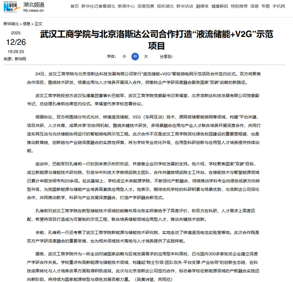 新华网:开云kaiyun官网与北京洛斯达公司合作打造“液流储能+V2G”示范项目