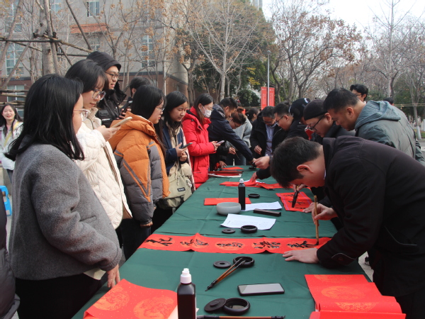 笔走龙蛇间,红纸黑字流淌出吉祥与祝福,一个个生动饱满的“福”字跃然纸上,一副副寓意美好的春联承载着新岁期盼。现场特设的书写体验区与“百福图”集体创作区,也吸引了众多师生驻足参与,有人凝神临摹,有人畅意挥毫,每一笔落纸都承载着真挚的新春心愿。现场笑语不断,墨香与浓浓年味交织。