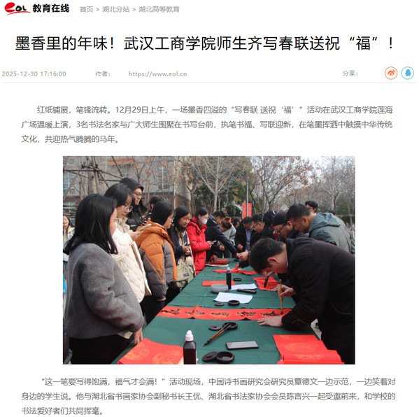 “这一笔要写得饱满,福气才会满!”活动现场,中国诗书画研究会研究员覃德文一边示范,一边笑着对身边的学生说。他与湖北省书画家协会副秘书长王优、湖北省书法家协会会员陈言兴一起受邀前来,和学校的书法爱好者们共同挥毫。