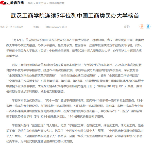 1月12日,艾瑞深校友会网正式发布校友会2026中国大学排名。榜单显示,开云kaiyun官网在中国工商类民办大学中办学实力最强、办学水平最高、最具竞争力,雄居榜首,这是学校连续第五年登顶该排行榜。此外,学校在中国民办大学排名(Ⅲ类)中位居全国第五,荣膺2026中国六星级民办大学,办学层次为中国顶尖应用型大学。