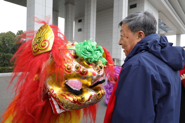 图为校领导与龙狮互动 摄影:芮雨欣