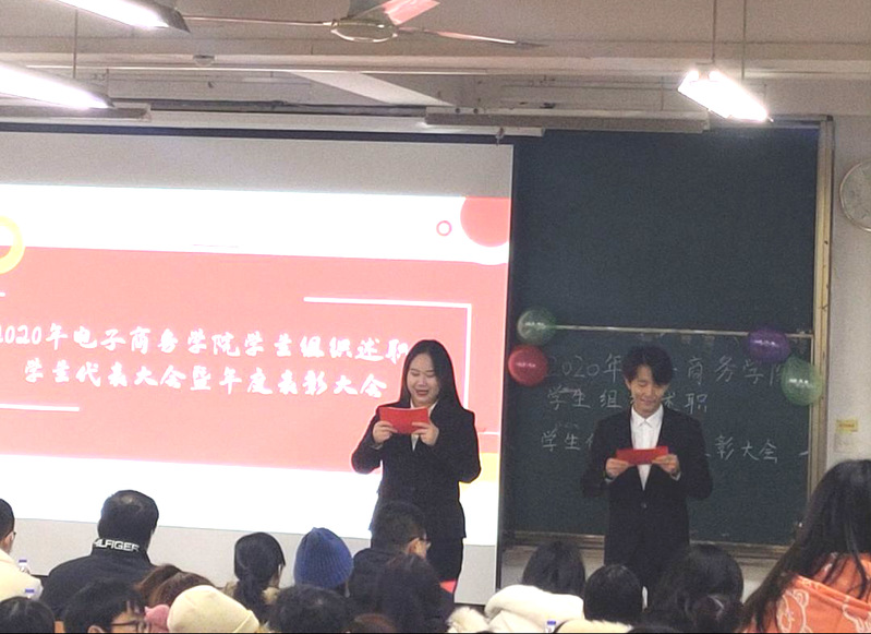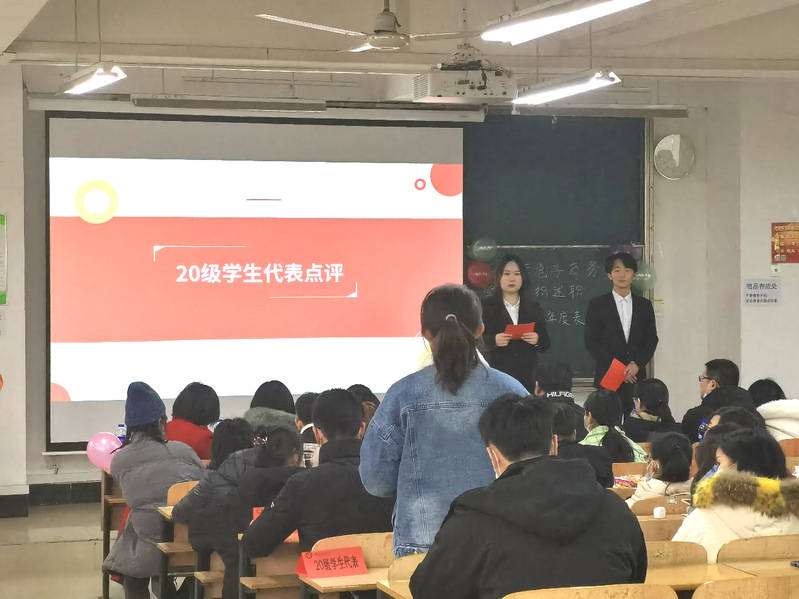 新闻中心讯(记者 刘旭光)12月14日中午12时10分,电子商务学院学生组织述职暨年度表彰大会在综合楼206顺利举行,此次大会旨在增强组织内部团结、明确职责,为电子商务学院贡献自己的力量。电子商务学院党总支书记杨睿、常务副院长魏华、教学副院长万辉、分团委书记舒娟、教学秘书李珊珊、18级辅导员苏晓宇、19级辅导员欧阳晓晶、20级辅导员刘芳莅临会议现场,同时全体学生组织成员和部分学生代表参加此次大会。大会由龚豫帆、候伟亮主持。
