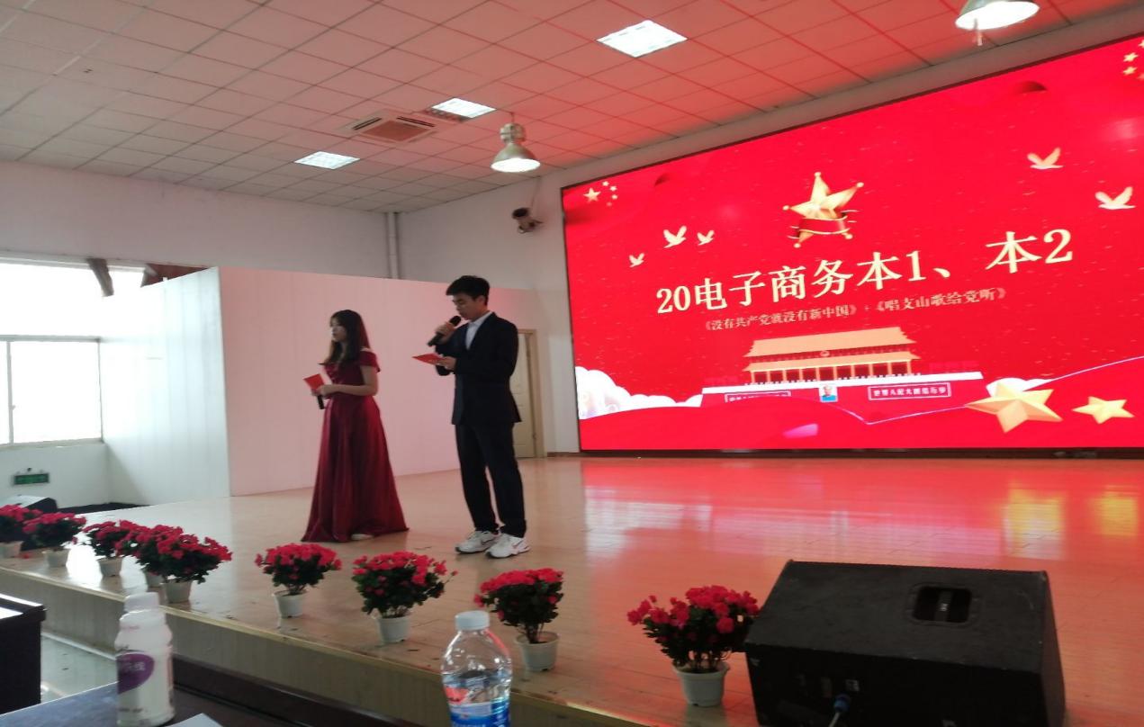 《中国,中国,鲜红的太阳永不落》和《唱支山歌给党听》是19电商本一、本二、本三、本四共同献给祖国建党100年的礼物,他们服装统一,脸上洋溢着微笑与自信。接着由马研协会表演诗朗诵《旗帜》,点燃了全场观众的激情。由19市场本一、本二、19信管本一合唱的《南泥湾》和《唱支山歌给党听》掀起了高潮,仿佛让我们又回到了那个时代,他们嘹亮的歌声以及所展现出的良好精神风貌令全场的观众连连叫好,整个现场都为之沸腾起来,将此次活动推向高潮。紧接着20电商本三、本四的同学分别为我们带来了《我的祖国》和《唱支山歌给党听》,熟悉而又动听的旋律回荡在整个现场。
