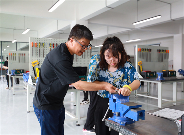 图为工程训练中心的老师正在指导学生进行钳工实训操作 摄影:张誉东
