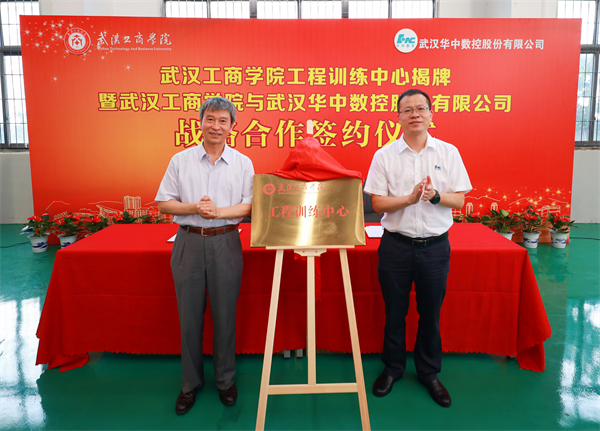 图为孔建益校长(左)与武汉华中数控股份有限公司总裁田茂胜(右)为工程训练中心揭牌 摄影:张誉东