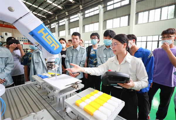 图为工程训练中心的老师正在向学生们介绍工业机器人设备 摄影:张誉东