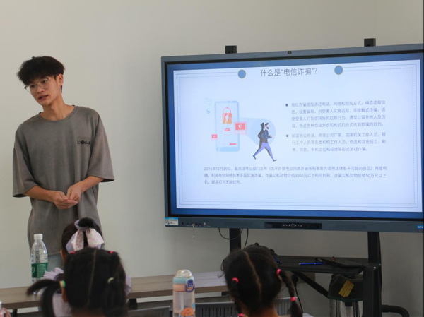 针对当前针对未成年人诈骗案件增多的情况,服务队特别强化了防诈骗教育。志愿者们针对乡村儿童认知特点,巧妙创设贴近生活的模拟情景,如“陌生网友索要信息”、“免费游戏皮肤陷阱”等,引导孩子们在角色扮演中识别潜在风险。他们用通俗易懂的语言,教会孩子们保护个人隐私信息、警惕网络诱惑,并牢记紧急求助渠道。生动的教学形式让孩子们在笑声中提高了警觉,掌握了应对技巧。