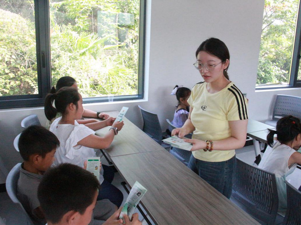 图为志愿者为小朋友们分发防溺水宣传页摄影:胡杰