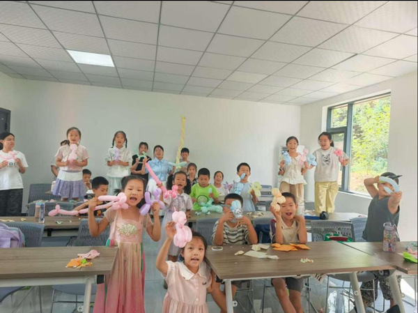 除植物拓印外,当日课程还设置了手工气球编织与折纸活动。在手工气球环节,志愿者教授了单泡结、双泡结等基础技法,孩子们发挥想象力用彩色气球制作出小狗、花朵等形态各异的气球造型,并开展“气球展示会”,现场充满“噗噗”的吹气声与欢笑声。折纸课上,志愿者以“青蛙”与“纸杯”为范例,引导孩子们通过折叠、剪裁创作出立体作品。