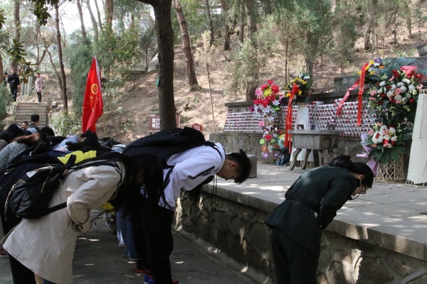图为学生代表们正在革命烈士陵园祭拜烈士 摄影:唐明悦